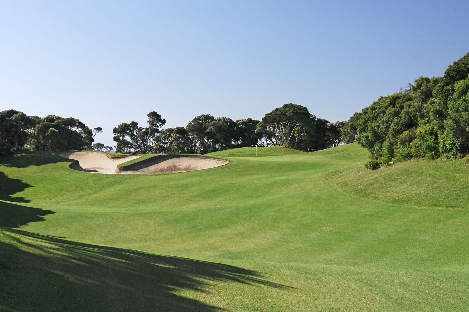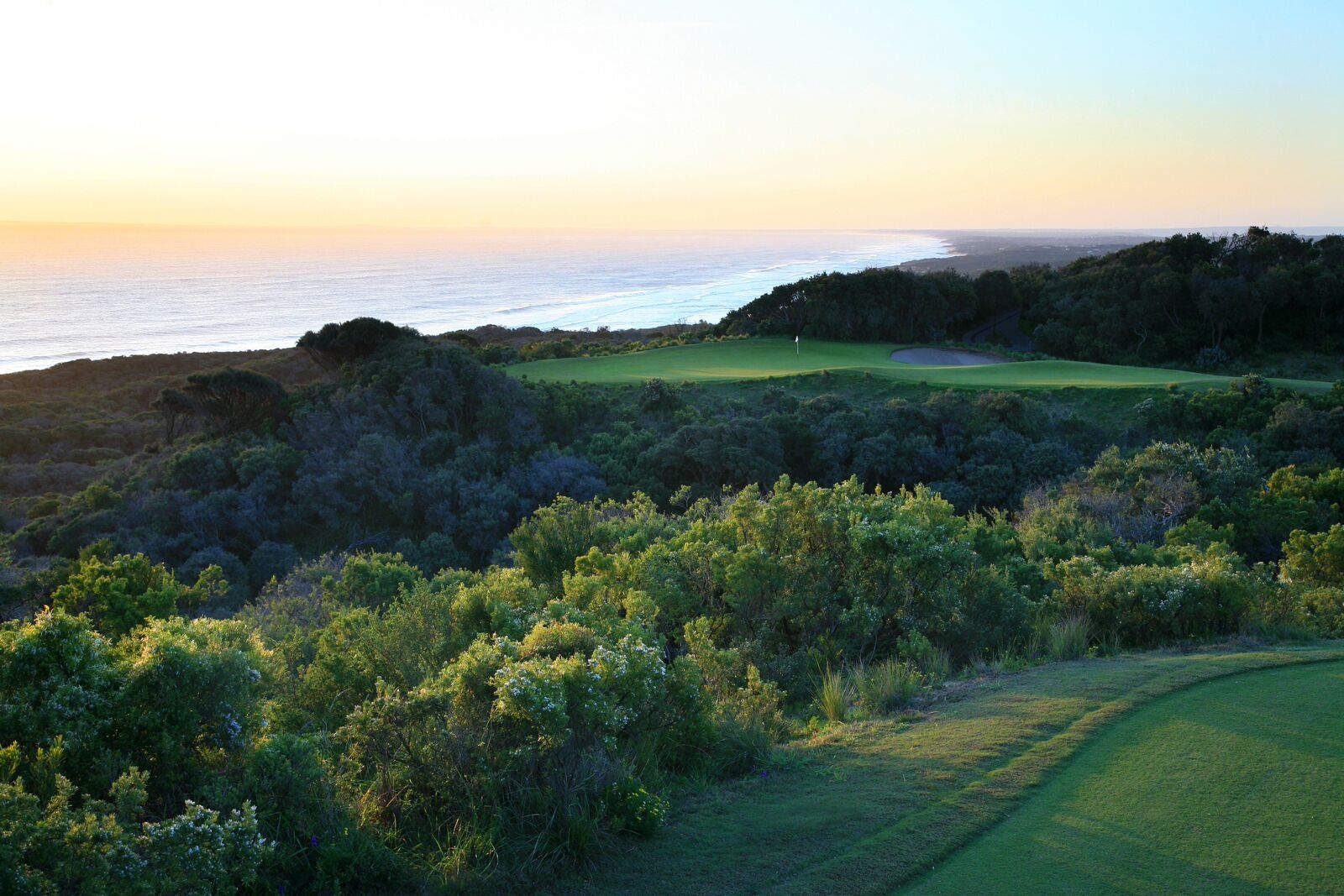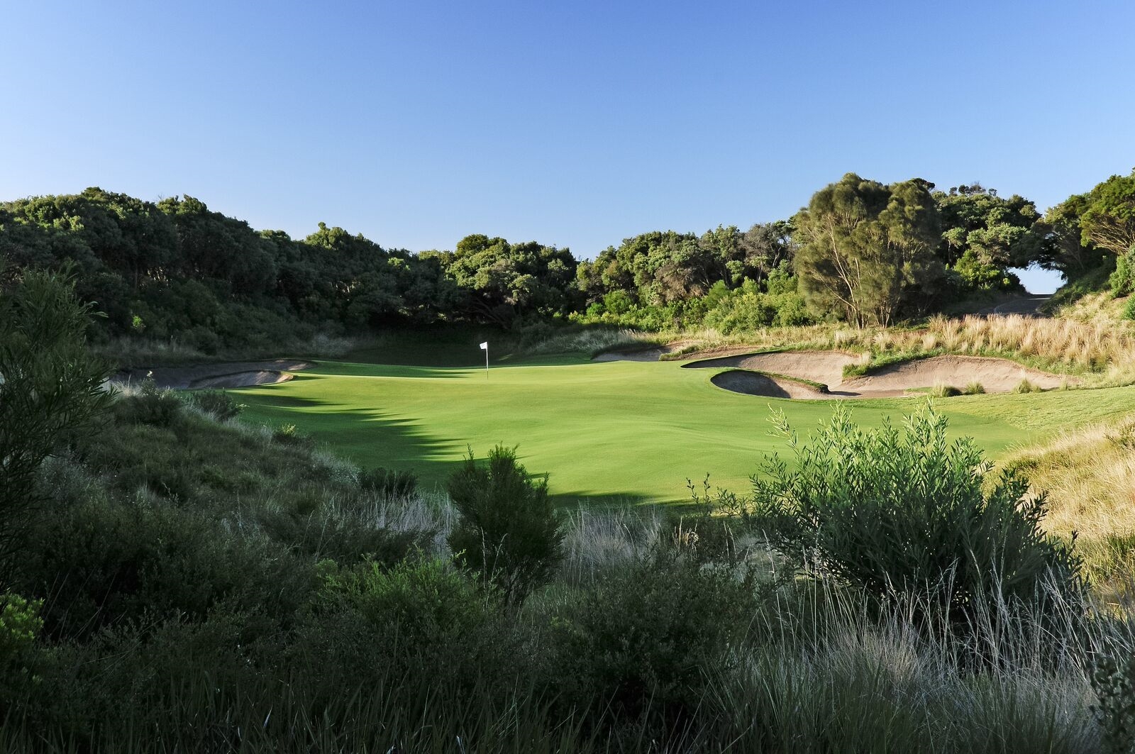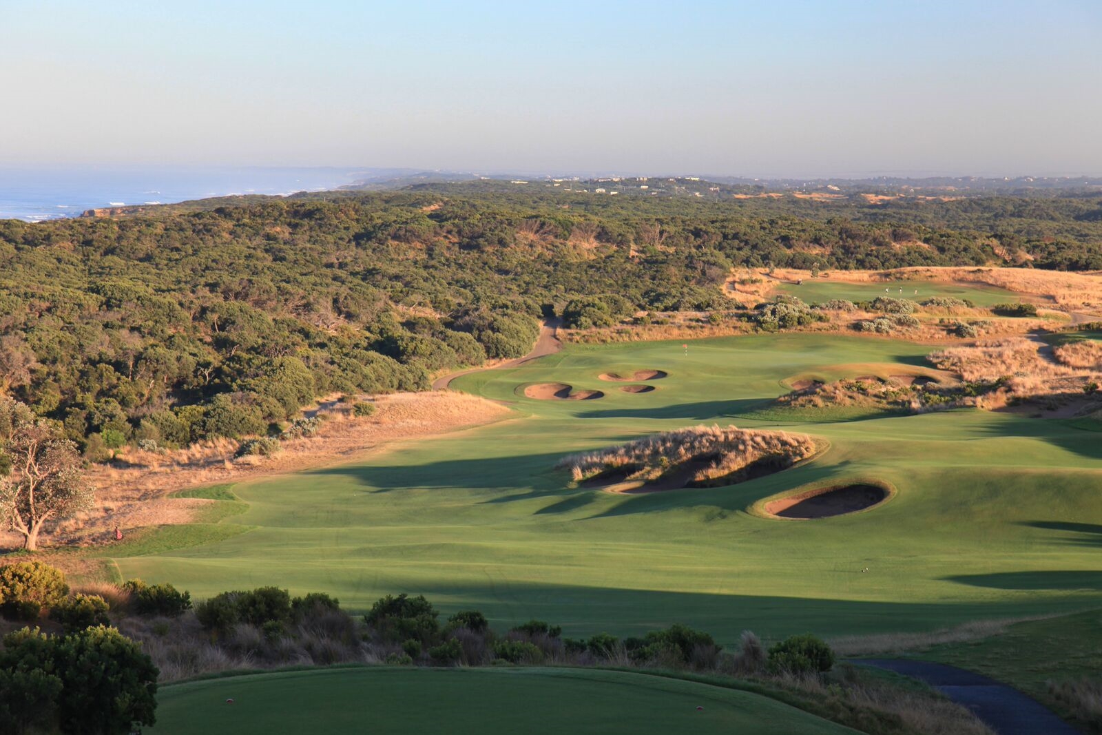 3 excellents parcours 18 trous à 1h30 au sud de Melbourne dans l'environnement paisible et majestueux de la "Mornington Peninsula". L'old course, dessiné par Robert Trent Jones borde l'Océan, diabolique, il propose un réel défi pour tous les joueurs avec quelques trous spectaculaires dont un très joli par 3 de 168 mètres qui vous obligera à franchir le ravin si vous ne voulez pas dire adieu à votre balle. (n'hésitez pas à prendre un club de plus). L'Ocean course, réalisation de Thomson et ses 6500 mètres des boules noires ... et le MOONAH course, qui même si on ne peut rien reprocher aux deux autres, est notre préféré. Splendide à tous points de vue, environnement, dessin, qualité d'entretient ...rien que du bonheur...bonheur qu'il faut toutefois mériter : 6576 mètres des boules noires, des greens magnifiques mais qu'il vaut mieux analyser avant de puter et quelques bunkers idéalement situés à éviter à tous prix ... un bijou signé Greg Norman !!! Ah qu'il est difficile de quitter ce petit paradis pour golfeurs !!!