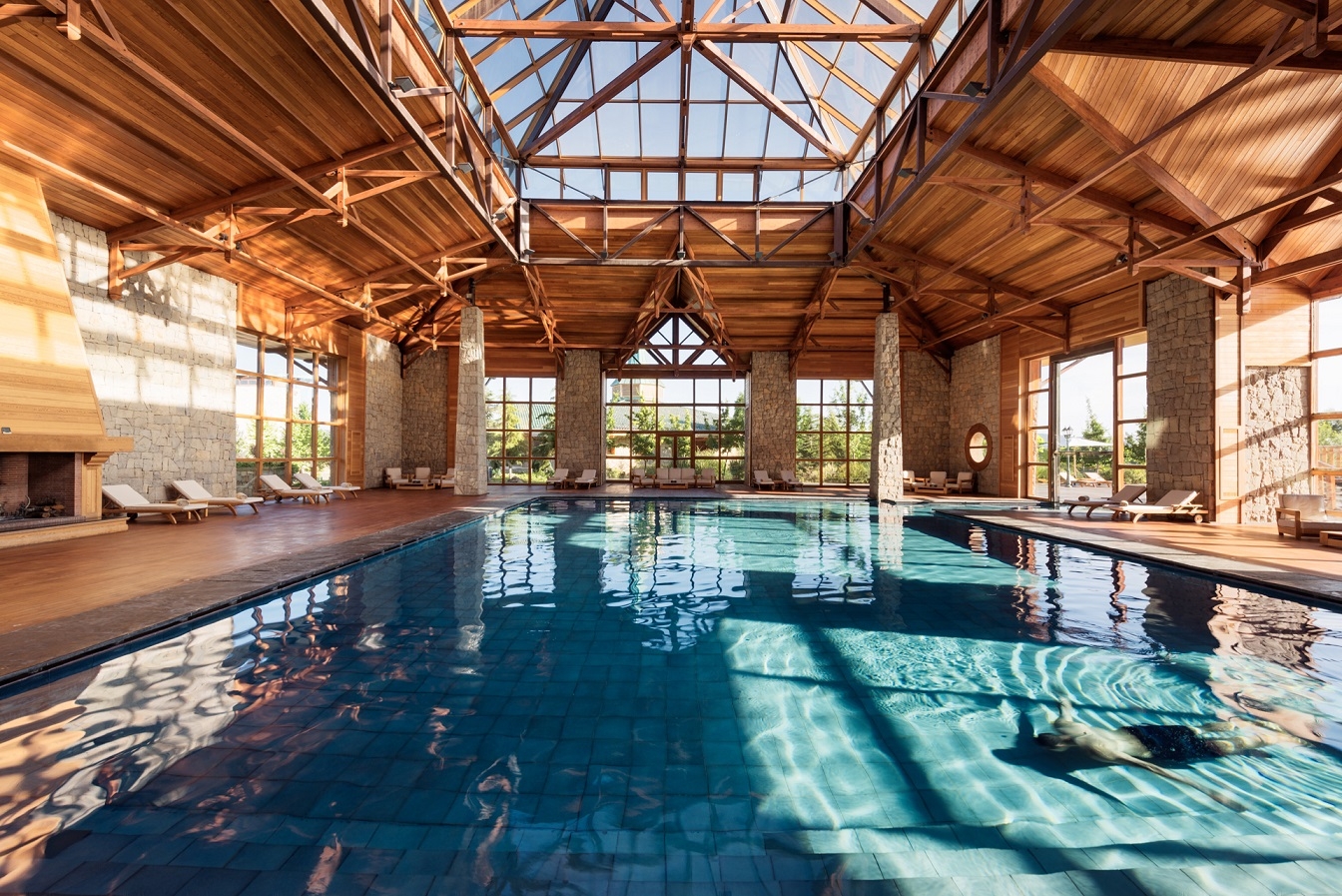 Ambiance chalet chic. Cheminées ça et là dans l'hôtel, confortables fauteuils club, piscines intérieure et extérieure, Spa de 3500 m2