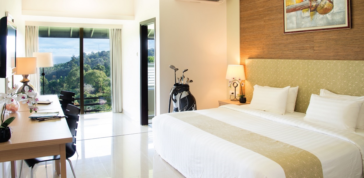 Chambres Par avec vue sur les Greens, chambre Birdie avec vue sur la mer de Chine et parcours, chambre Eagle également avec vue et plus spacieuse, chambre famille Albatros avec lit King accompagné d'un lit plus petit et vue sur la mer de Chine.