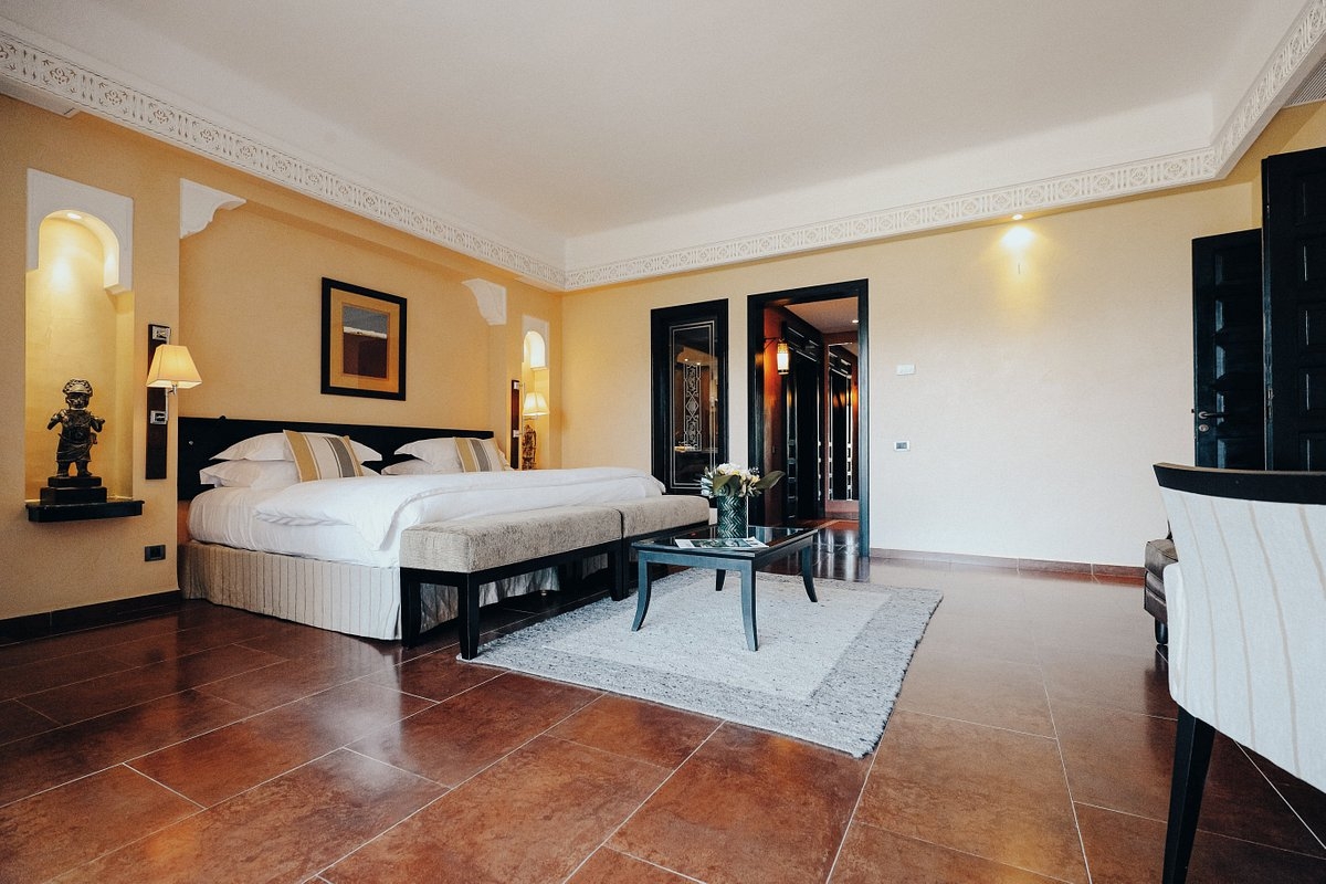 L'hôtel dispose d'une cinquantaine de suites spacieuses offrant une vue directe sur le parcours de golf ou les jardins.Les Junior Suites, d'environ 60 m², sont élégamment décorées dans un style contemporain aux touches marocaines et disposent d'une grande terrasse privée.Des Suites Senior plus vastes ainsi qu'une Suite Royale sont également proposées pour un séjour encore plus exclusif.Toutes les suites sont équipées d'une salle de bain complète avec baignoire et douche, climatisation, wifi, télévision satellite, minibar, coffre-fort et coin salon confortable.