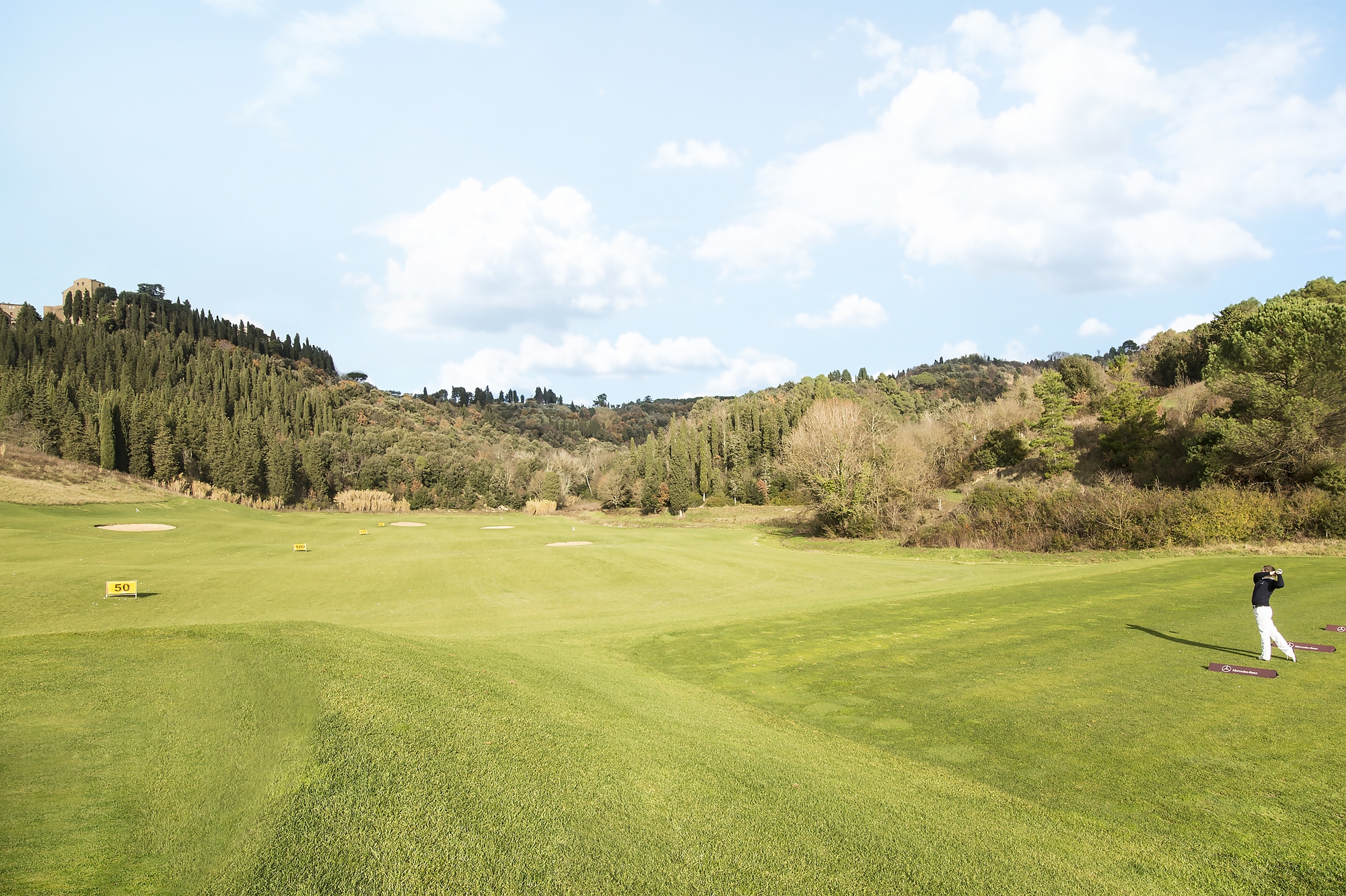 Begonnen met een west georiënteerd tee, de Golfbaan lus terug op zichzelf, het omhelzen het glooiende Toscaanse landschap en eindigt terug bij de Club House.